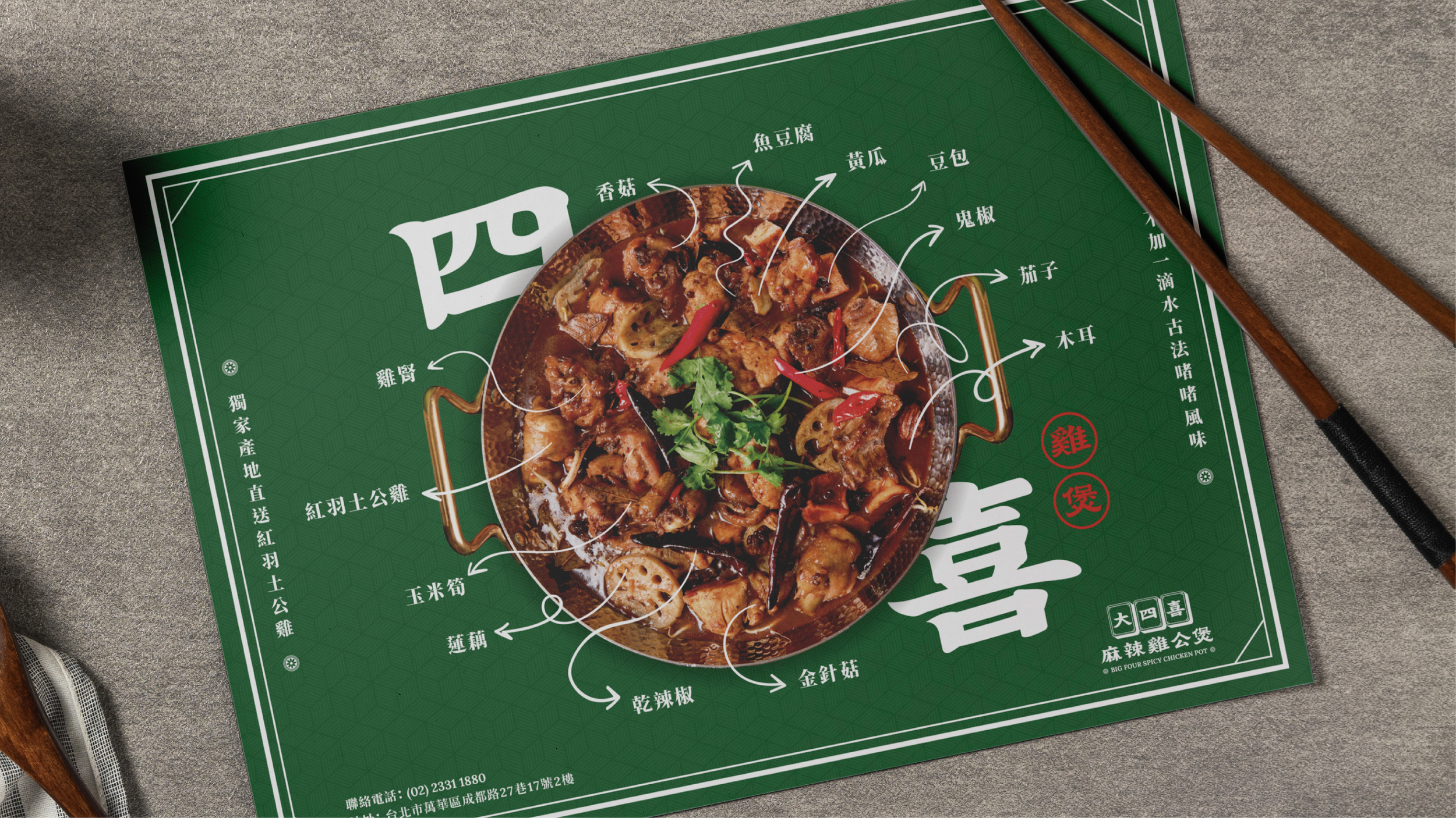大四喜麻辣雞公煲 Big Four Spicy Chicken Pot透過麻將元素的巧妙運用,以簡約的麻將磚造型,傳遞品牌特色與記憶點。品牌標準字採用精緻的港風手寫字體設計,展現道地古法料理的匠人精神。