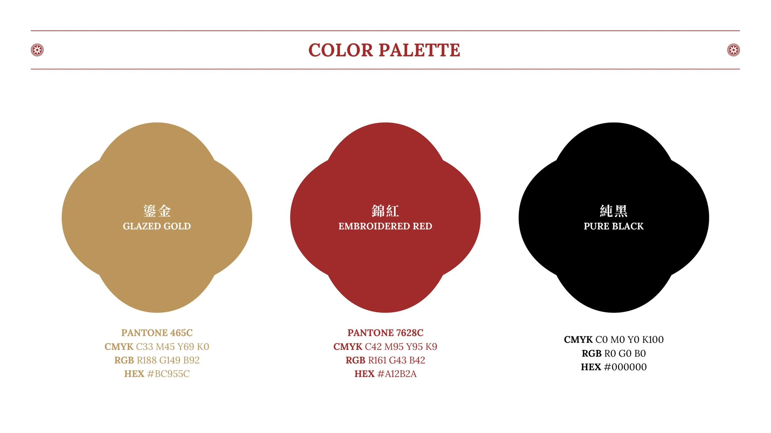 而畫面中的框飾、徽章與圓形花符則借鏡大四喜的文化語彙,並以較細膩的線條與更現代的比例重新詮釋,使整體在「傳統味」與「當代感」之間取得平衡。