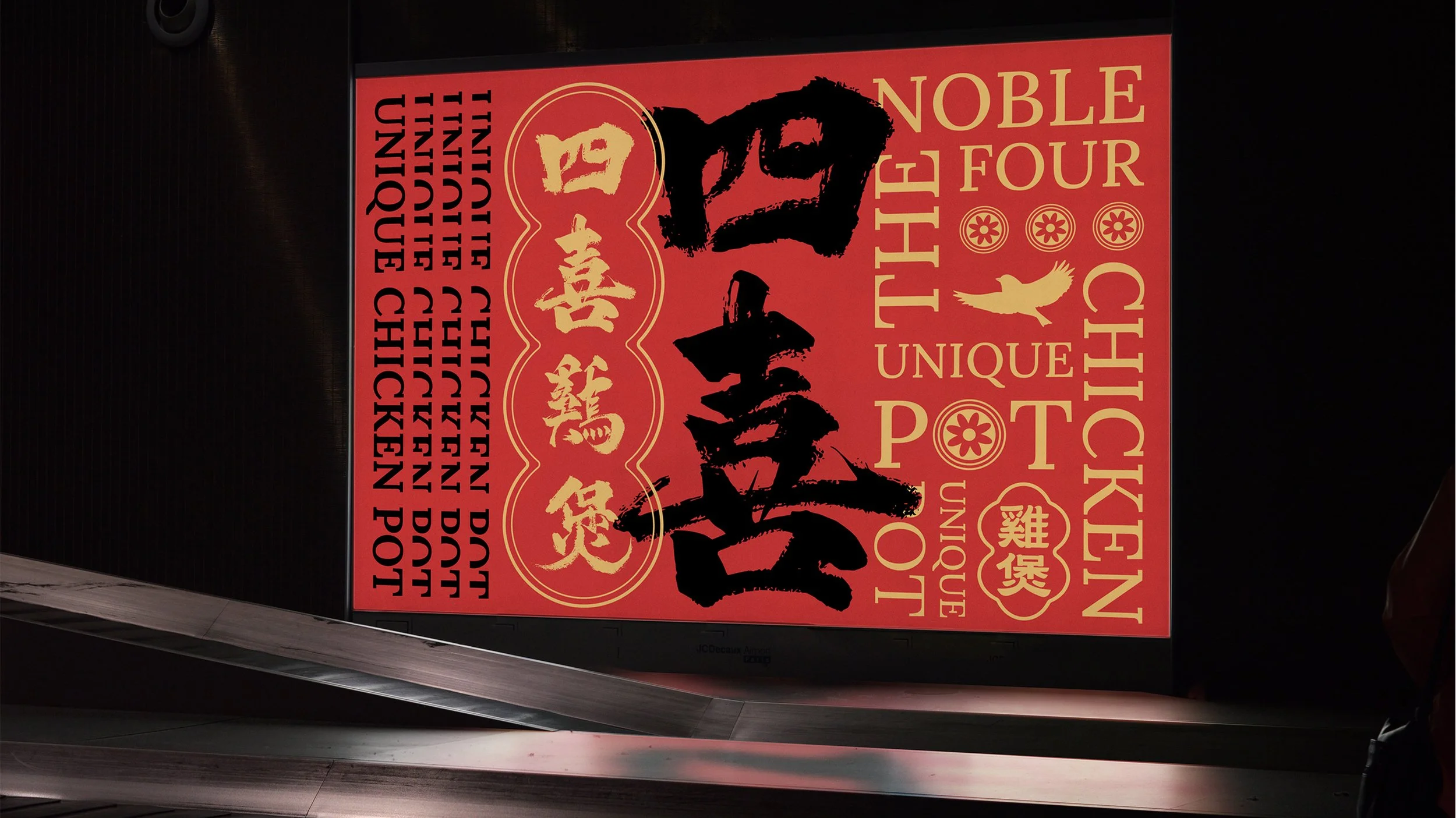 主視覺邀請書法藝術家以全手寫書法呈現「四喜幾煲」四字,以濃墨重筆書寫,筆鋒粗烈、轉折帶勁,象徵大四喜品牌的鍋氣底蘊與辣度性格;同時在書寫邊緣保留局部飛白與墨痕,使其帶有更奔放的能量感,轉譯成個人鍋品牌專屬的鮮明個性「爽辣、直接、有態度」。