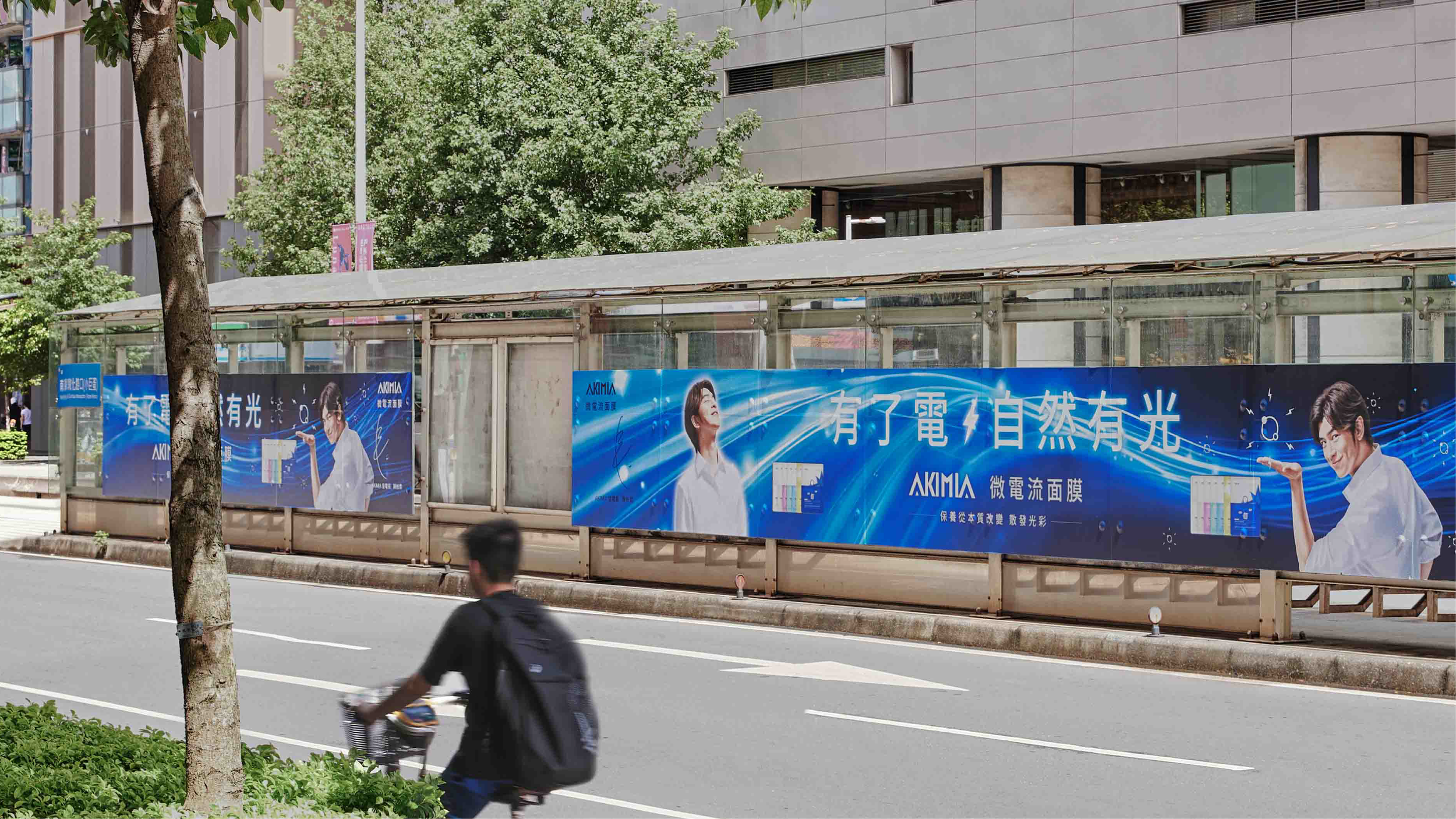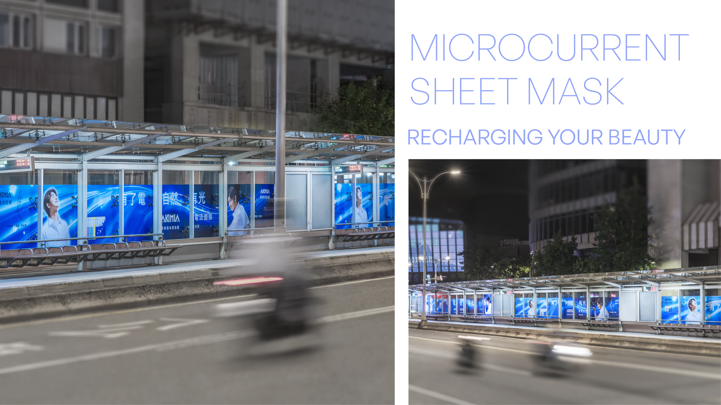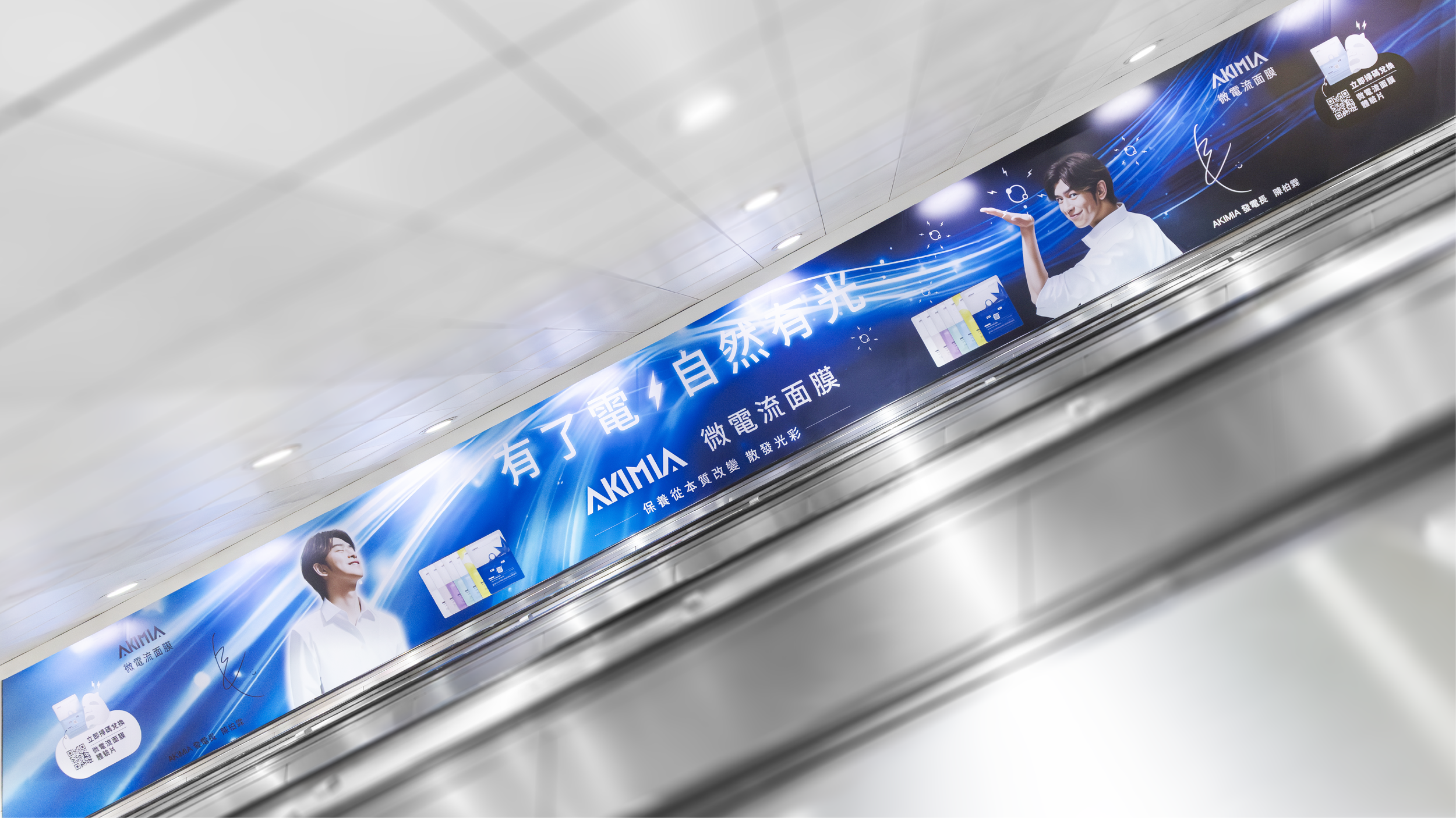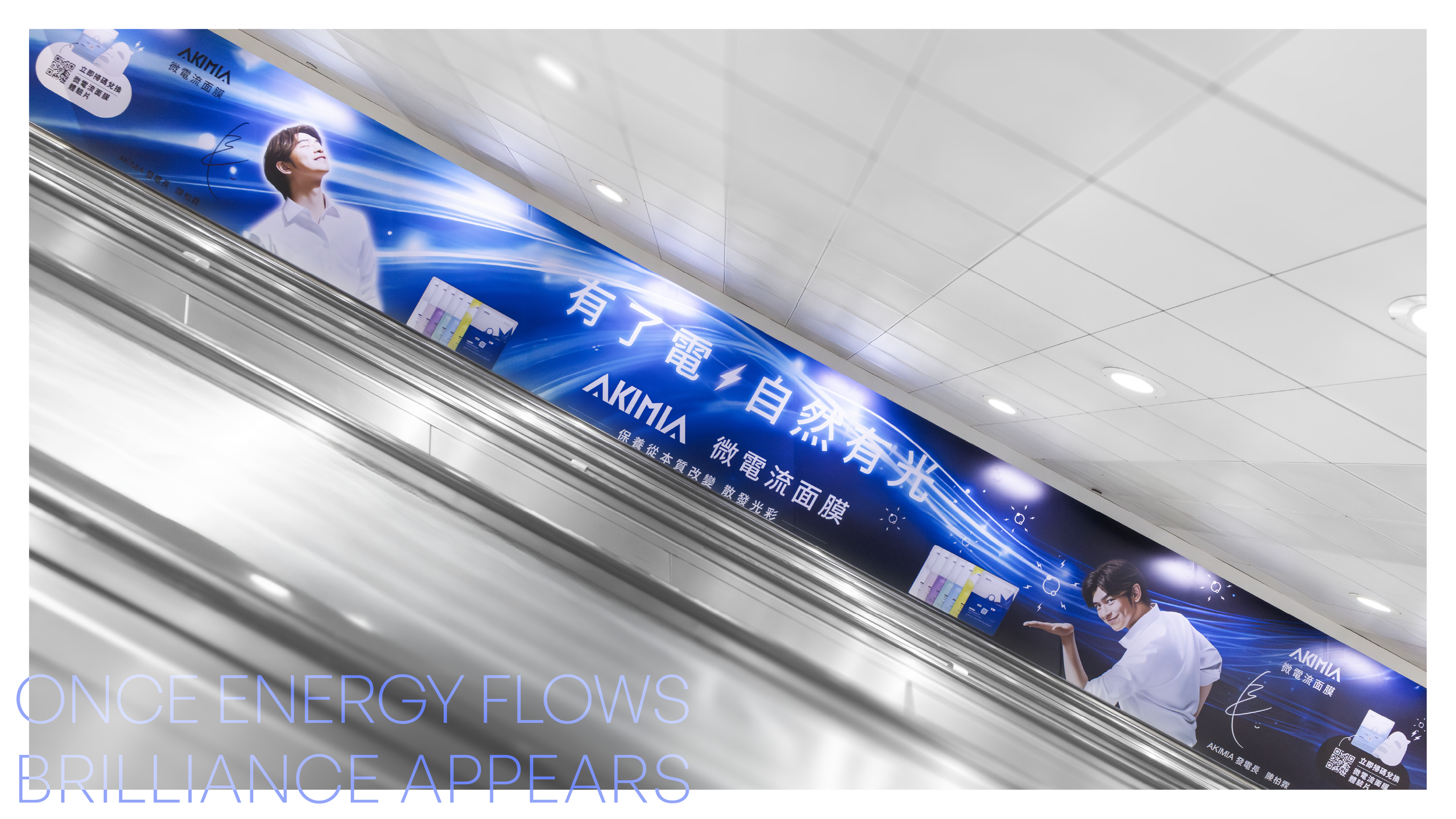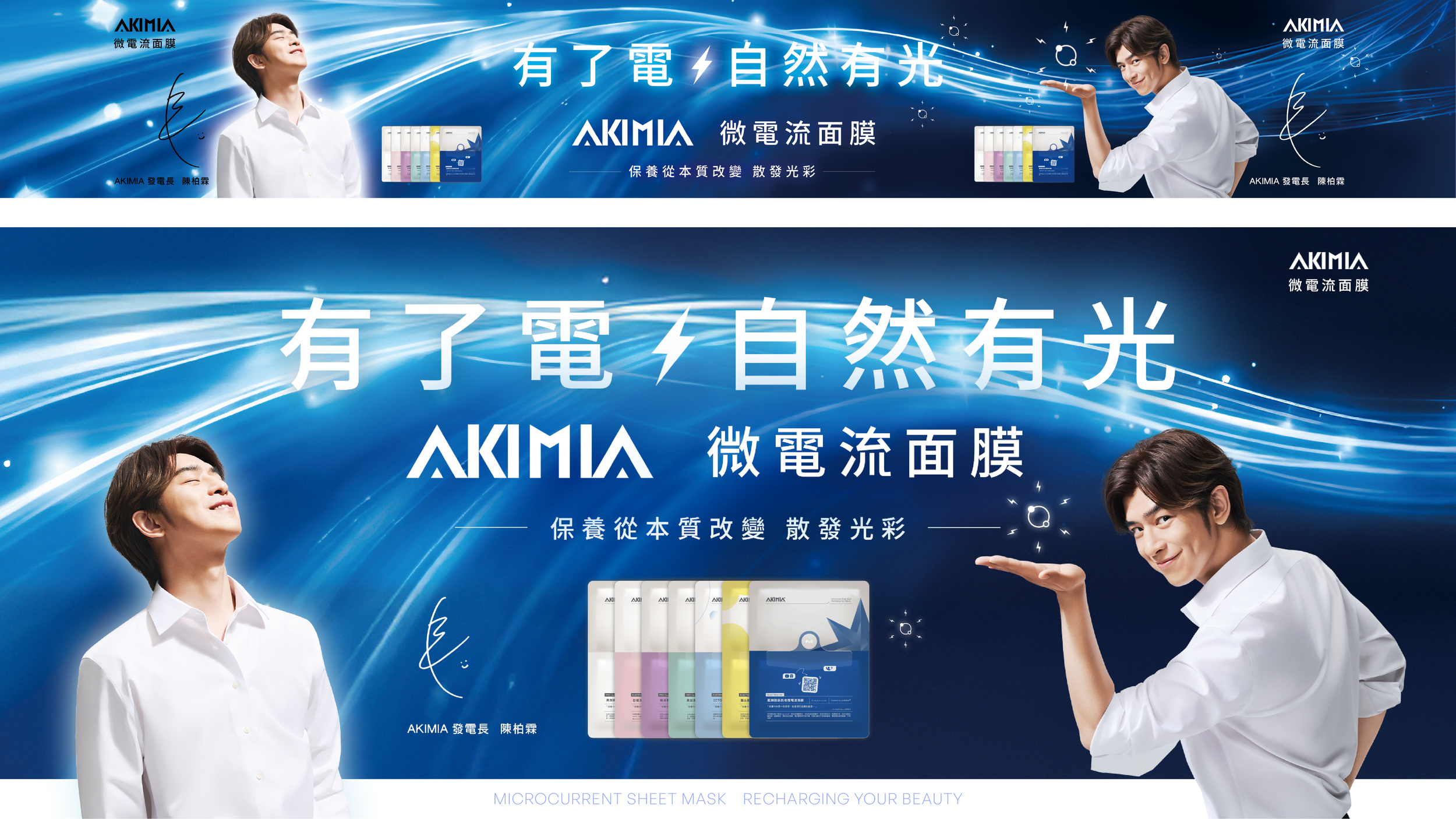 AKIMIA 有了電,自然有光 微電流面膜 陳柏霖在本次 AKIMIA 新品上市專案中,以流線電光作為主視覺的視覺主體,延伸出科技、滲透、電流般的氛圍,透過人物姿態、光線方向與能量動勢的整合,使廣告不只是展示產品,而是讓觀者直觀感受到「能量被啟動、光被喚醒」的瞬間。