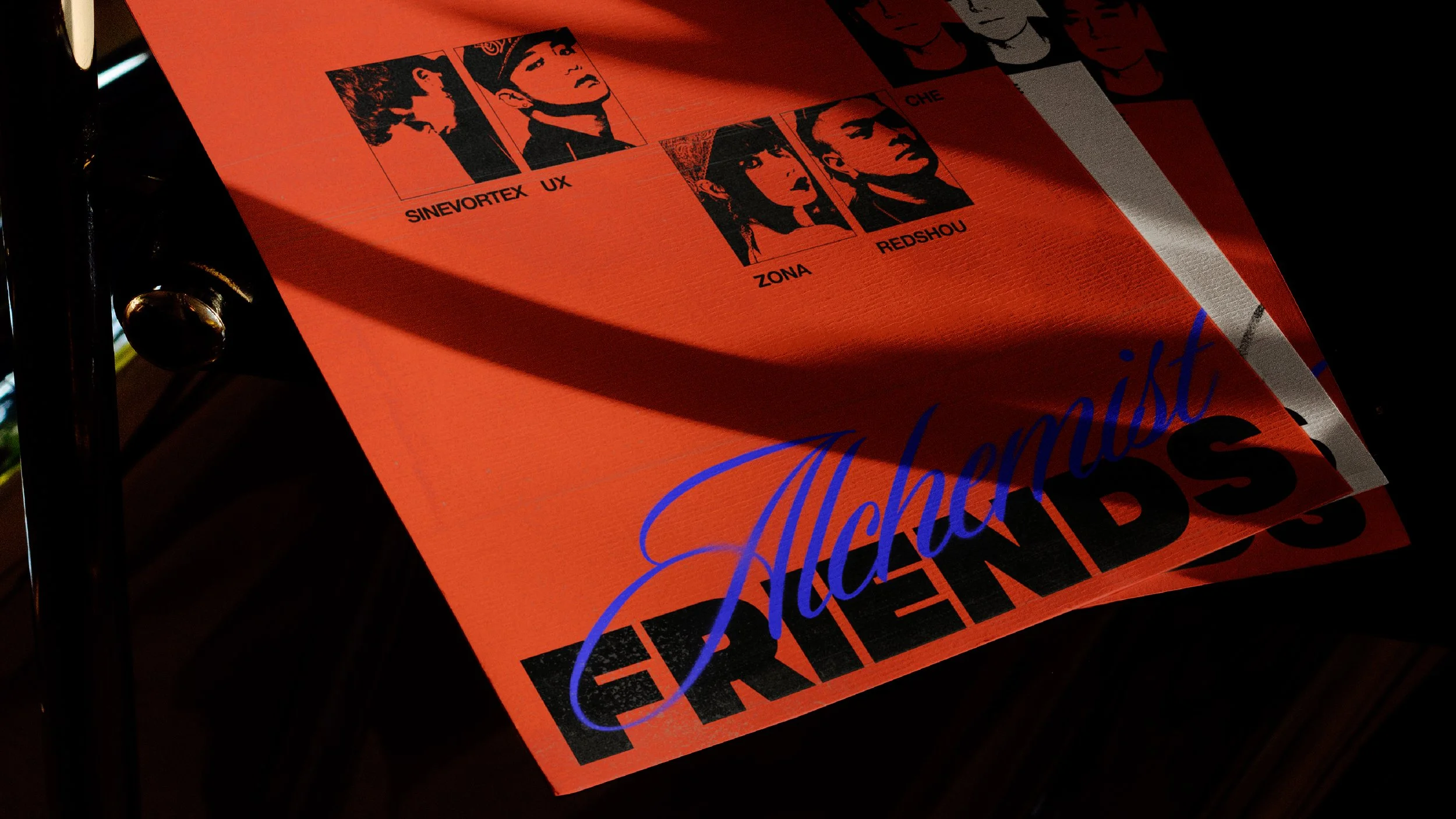 ALCHEMIST & FRIEND Vol.2以地下音樂的實驗性粗獷視覺語彙,呼應活動以 Boiler Room 為靈感的沉浸式定位,整體色調採用大面積飽和的暖橙色作為背景,賦予畫面強烈而鮮明的視覺侵略性,高反差的視覺處理,模擬了絲網印刷特有的原始質感,捕捉音樂現場那樣純粹且直擊感官的生命力。