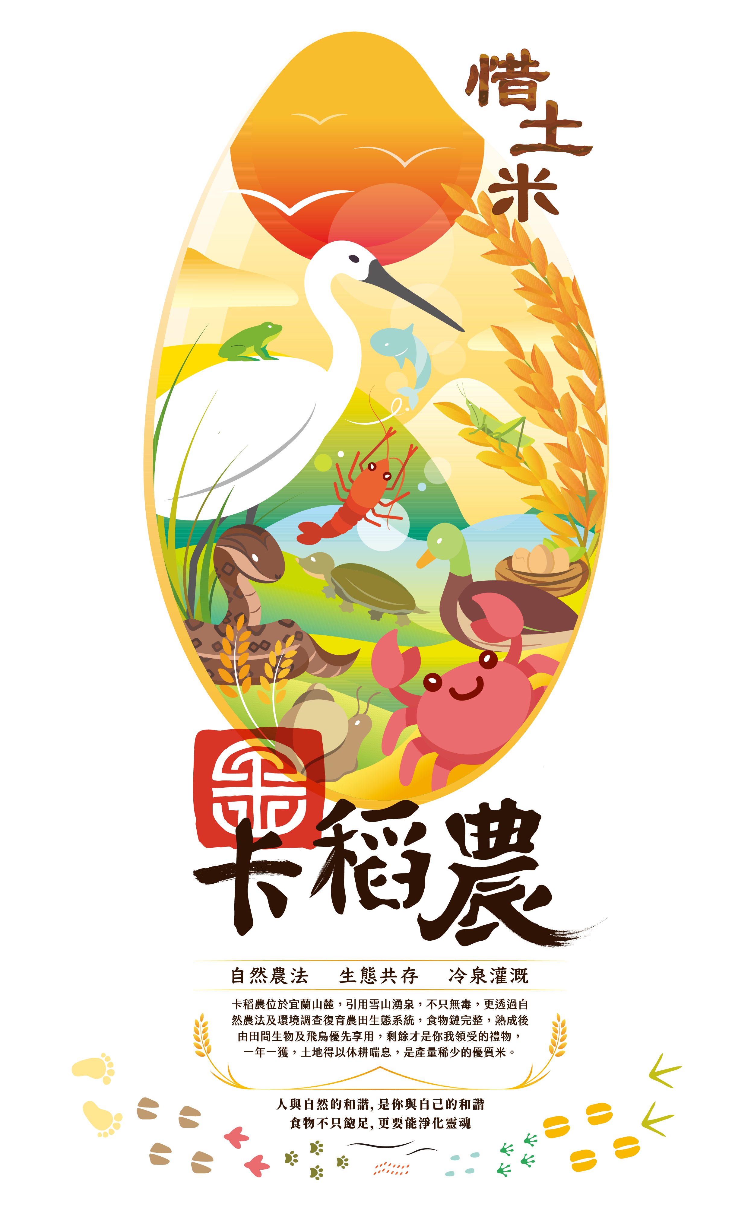 於畫面底部設計腳印巧思,以腳印走過的方向性表現「由多樣的田間生物們優先享用稻作,最後才是卡稻農感恩領受的禮物」,以傳遞品牌獨有的核心理念。