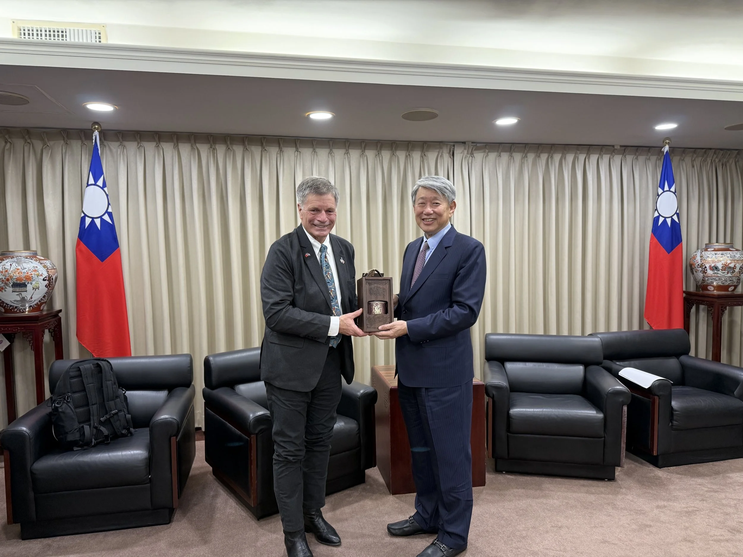這個木箱包裝只有製作3組,送進總統府給「副總統—蕭美琴」、「外交部長—林佳龍」、「經濟部長—郭智輝」,連我都沒看過本人,也沒有自留,也進不去總統府,還好有這組照片!